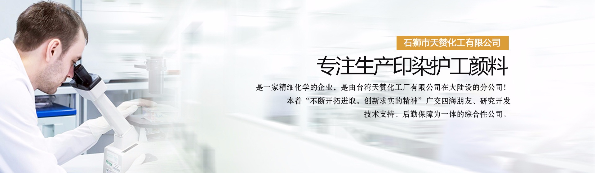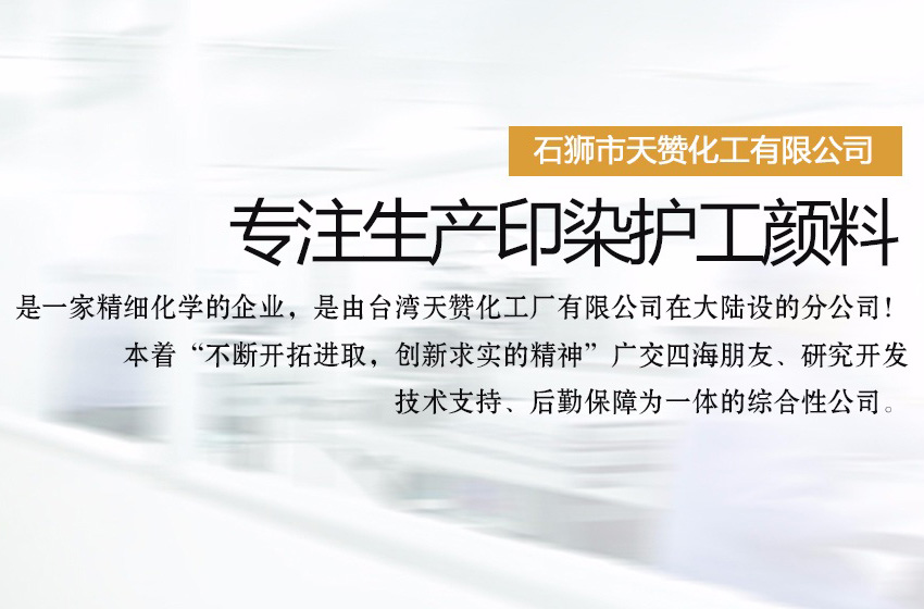 石獅市天贊化工有限公司是一家生產(chǎn)印染護(hù)工顏料的公司,是一家精細(xì)化學(xué)的企業(yè),是由臺(tái)灣天贊化工廠有限公司。在大陸設(shè)的分公司!本著“不斷開(kāi)拓進(jìn)取,創(chuàng)新求實(shí)的精神”廣交四海朋友、研究開(kāi)發(fā)、技術(shù)支持、后勤保障為一體的綜合性公司。二十年來(lái),我們對(duì)紡織,前處理,后整理,技術(shù)的研究實(shí)踐中體會(huì)得經(jīng)驗(yàn)。